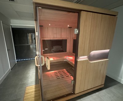 Hyperbaric oxygen therapy, infrared sauna, red light therapy, muscle recovery tools, IV therapy, injections, and ongoing lab monitoring.